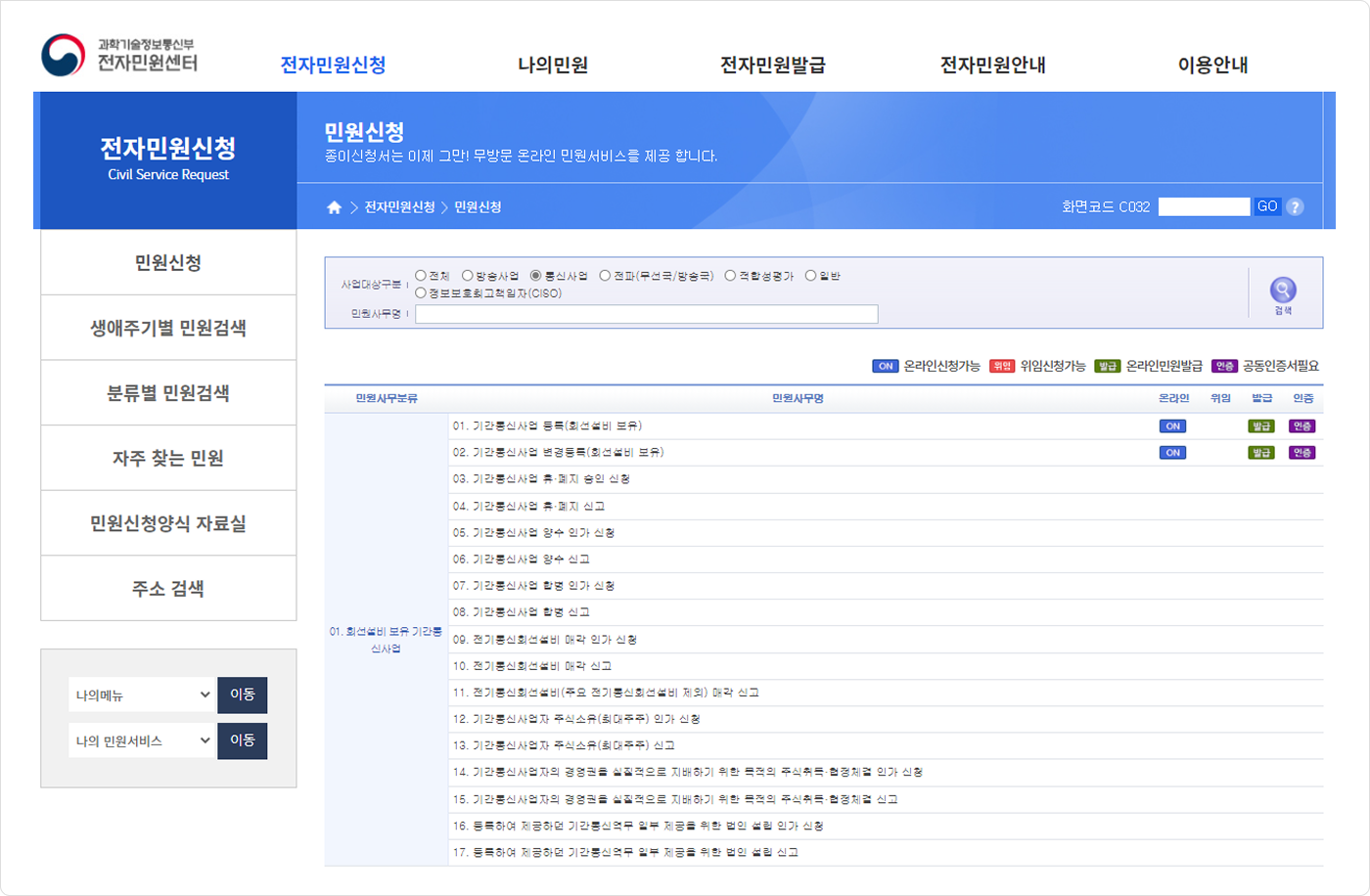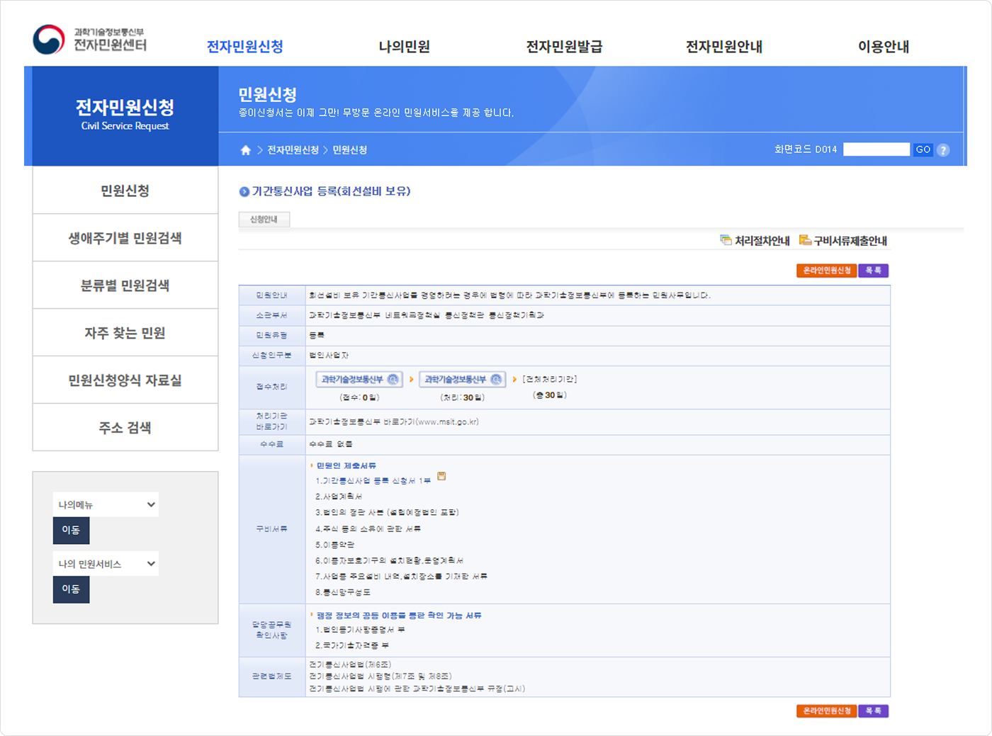 주파수 신청(할당)과 함께 기간통신사업자 등록을 과기정통부 전자민원센터를 통해 신청해야 합니다.