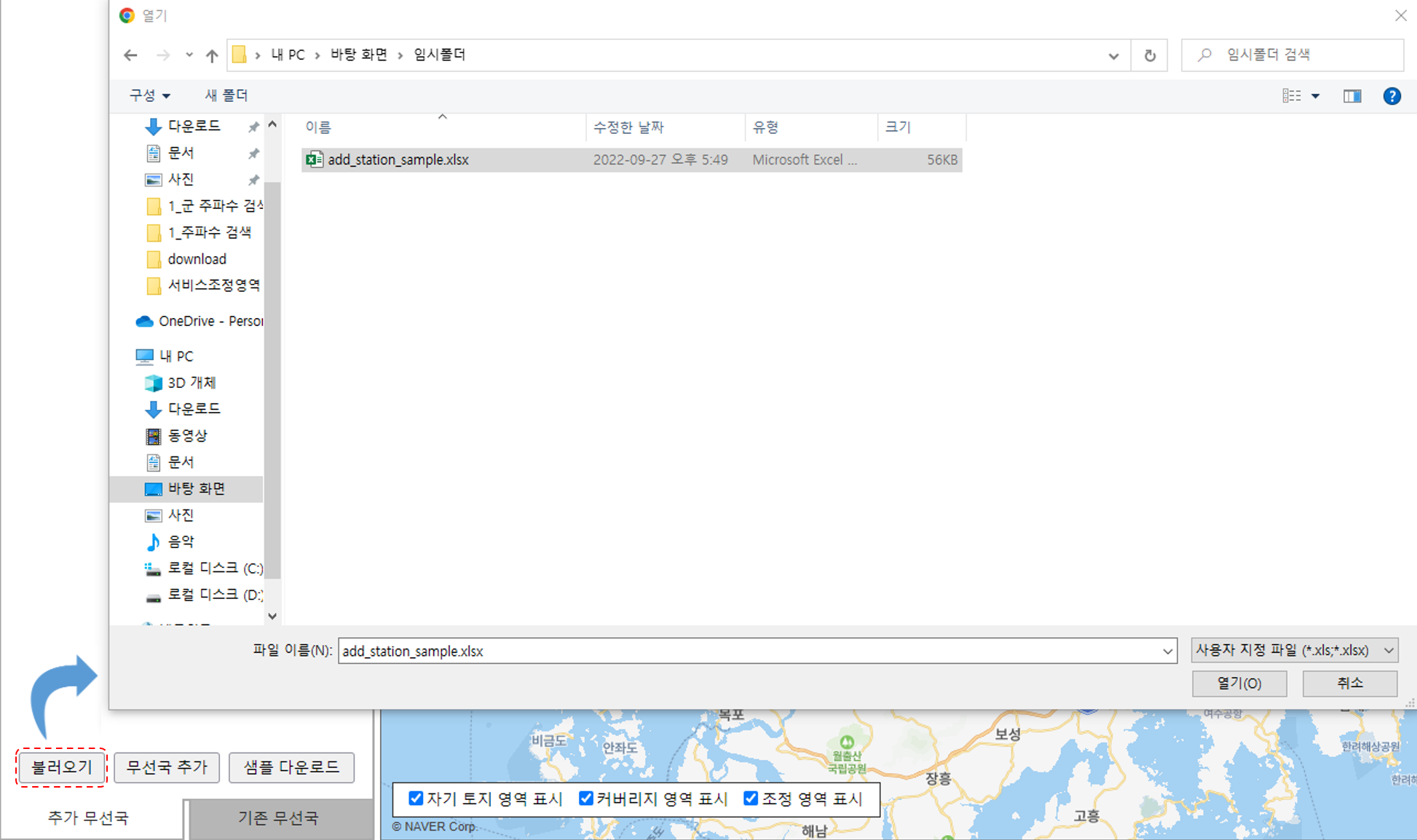 추가 무선국탭에서불러오기버튼을 클릭하고, 작성한 파일을 불러옵니다.