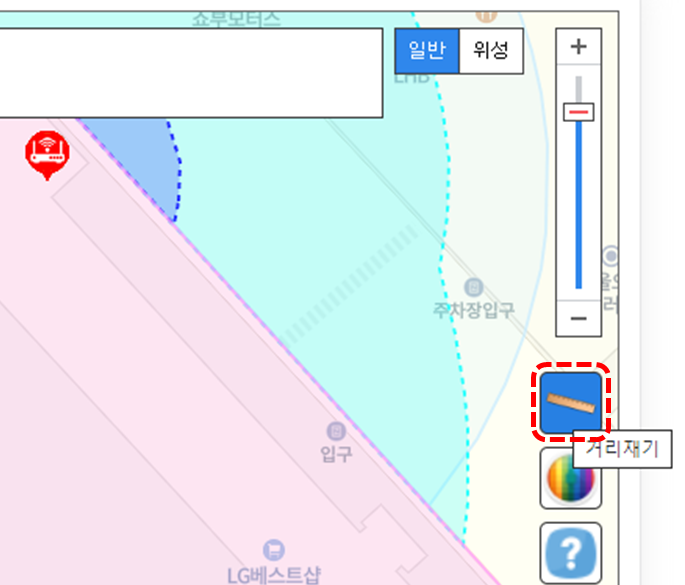 - 거리재기 모드가 실행되고, 지도의 지점을 클릭할 때 마다 해당 지점과 지점 사이의 거리가 표시됩니다.