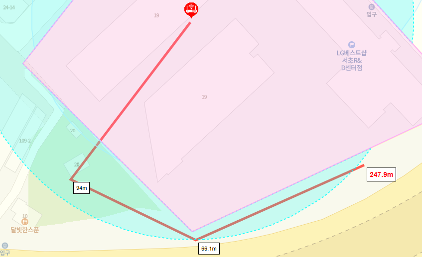 - 마우스 오른쪽 클릭을 하면 거리재기 모드가 종료되고, 최종 거리가 빨간색으로 표시됩니다.