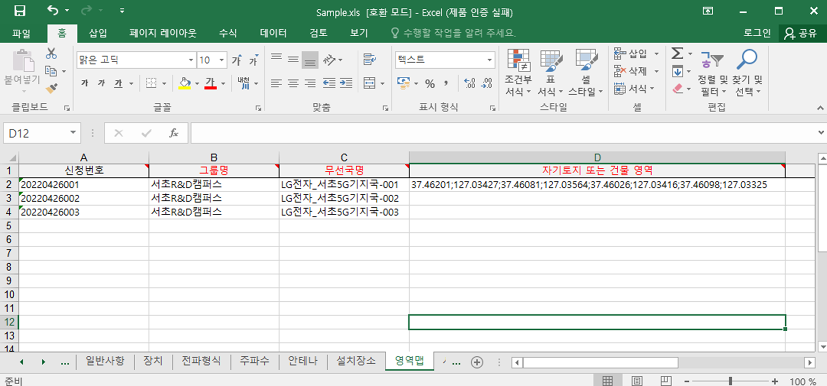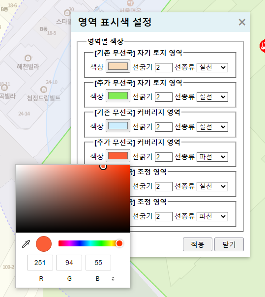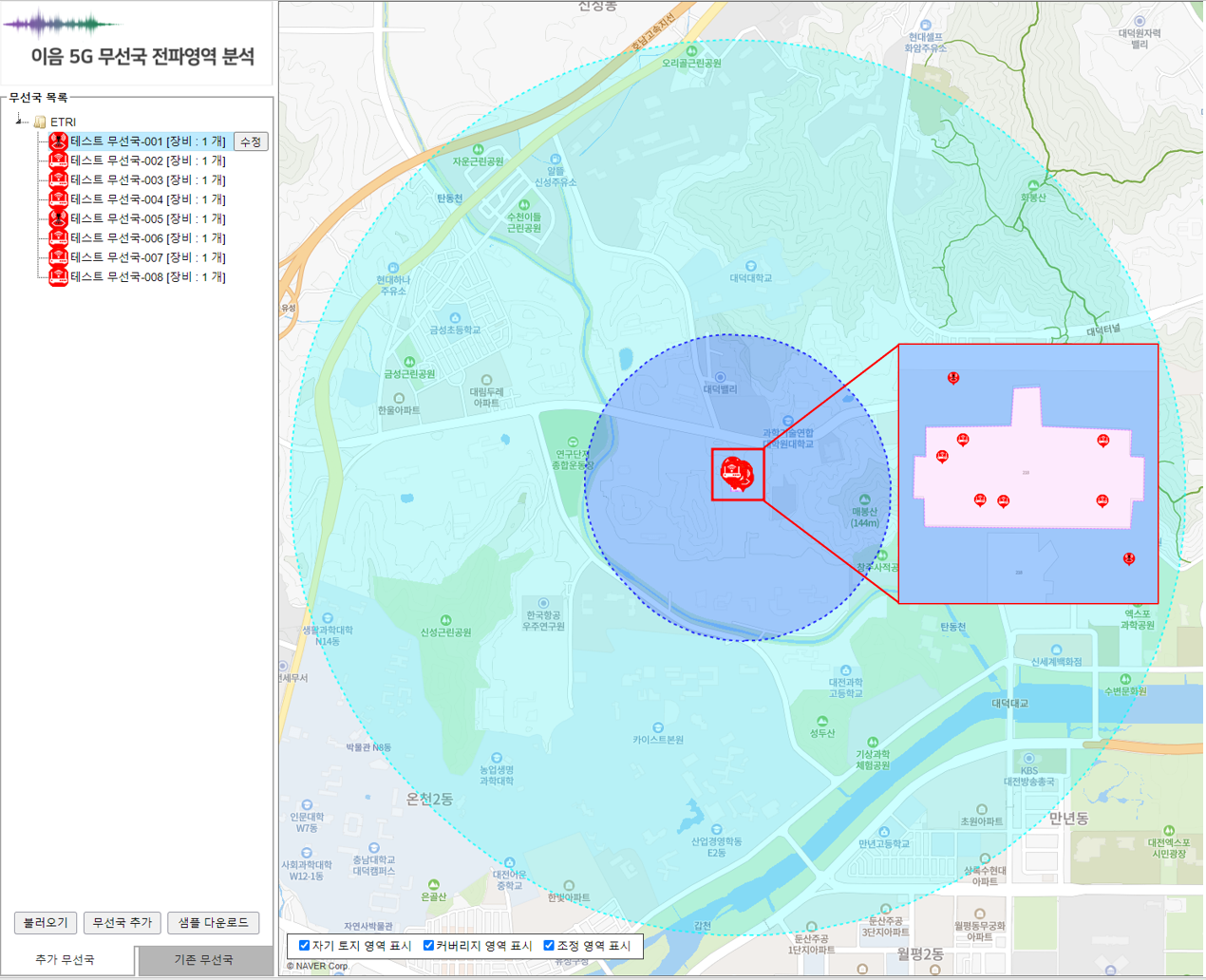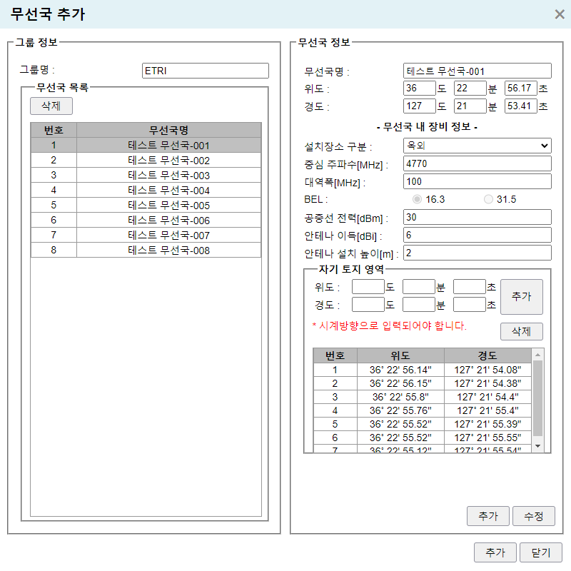 - 작성된 내용으로 무선국 정보가 추가되고, 영역 정보를 계산하여 표시합니다.