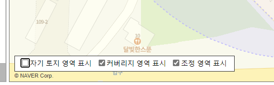 - 지도 좌측 하단에 자기 토지/커버리지/조정 영역 항목의