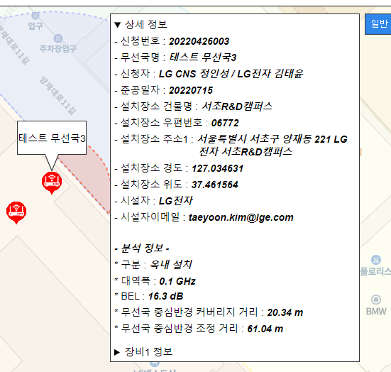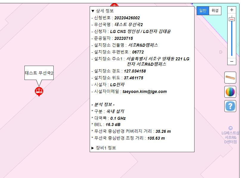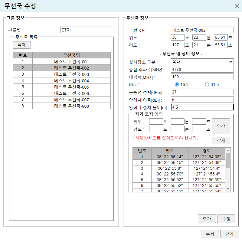 - 작성된 내용으로 무선국 정보가 수정되고, 영역 정보를 재계산하여 표시합니다.